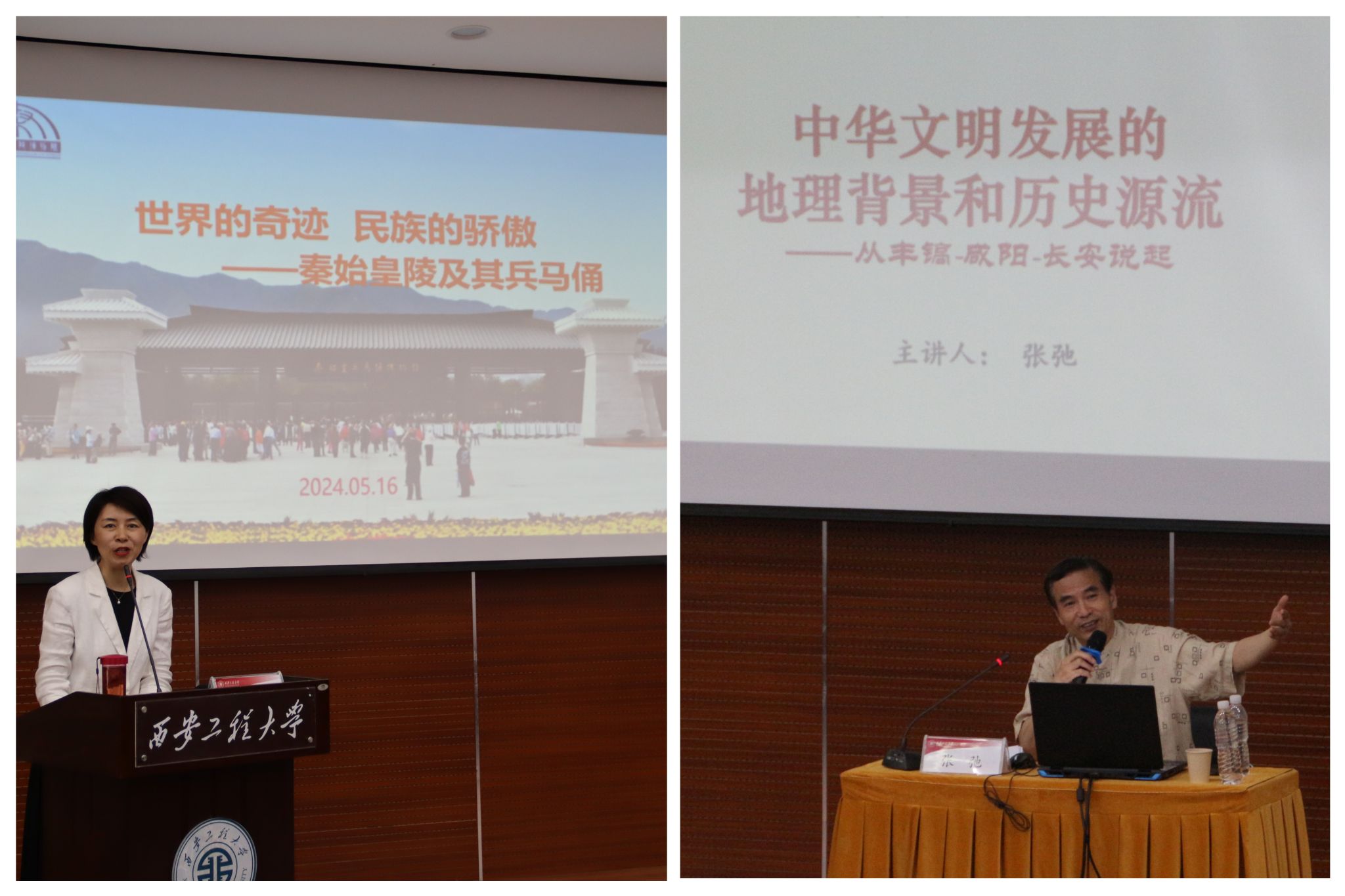 5月16日,邀请秦始皇帝陵博物院社会教育部主任、副研究馆员农茜,来校做题为《世界的奇迹 民族的骄傲——秦始皇陵及其兵马俑》专题讲座。农茜老师从珍贵的文化遗产、发展中的博物院、传承的青春力量三个方面展开报告,带领师生走近秦始皇陵及其兵马俑的发现、保护和文化遗产传承的时空历程中。5月22日,邀请中国博物馆协会理事、全国教育文物研究会常务理事、陕西高校博物馆专业委员会主任委员张弛,来校做《文化自信的地理纬度——从丰镐-咸阳-长安说起》专题讲座。张弛老师以历史的时间线为脉络,从中华文明的地理背景出发,生动讲述西安这片土地在历史的长河中伴随中华文明的蓬勃发展和开枝散叶所经历的历史变迁。两位老师在讲座结尾不约而同地呼吁青年学生投身文化事业发展,以青春的靓丽色彩点亮中华民族的文化自信,为实现中华民族伟大复兴的中国梦持续奋斗。