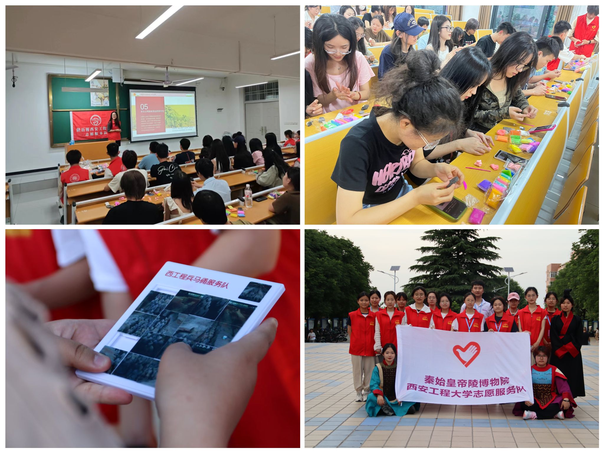 5月16日至17日,校青年志愿者协会秦始皇帝陵博物院志愿服务队、陕西历史博物馆志愿服务队分别在两校区开展文博进校园活动。 通过文博讲解、知识问答、文物拼图、线上文物修复、秦小篆仿写、陶俑制作等形式多样、内容丰富的游戏,为青年学生提供近距离接触文化遗产的机会,让大家走近博物馆,发现世界文化的宝藏,感受历史的厚重和艺术的魅力,怀揣敬畏之心,保护和传承好人类智慧。