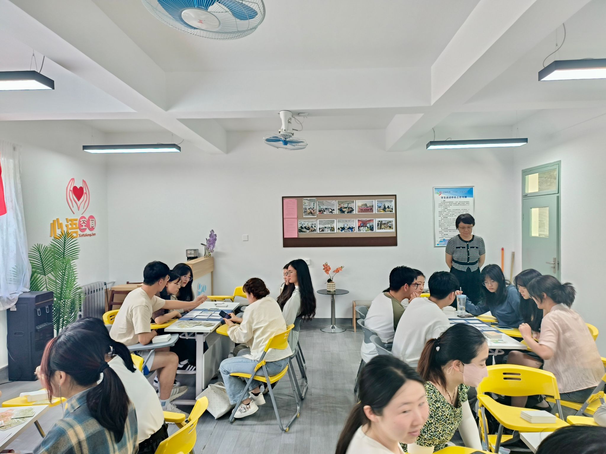 活动过程中,同学们抽取明牌和盲牌,并根据图片内容,介绍卡片与自身的链接。在刘蓉的带领下选择字卡,组成方阵,并分组阐述选择卡片的理由,通过不同组别和不同人的选择行为,让同学们感受到不同的性格特征。接下来,每个人盲抽一张卡片,依次放入字卡方阵中,并解释自己的摆放理由。经过36轮卡片摆放和理由阐述,体现出大家对同一张图片理解的差异,隐含着每个人不同的潜意识,象征着每个人内心深处的世界。最后,同学们以卡为媒对现在的自己、理想中的自己以及从现在走向理想状态中的自己作了介绍,对未来进行了展望。