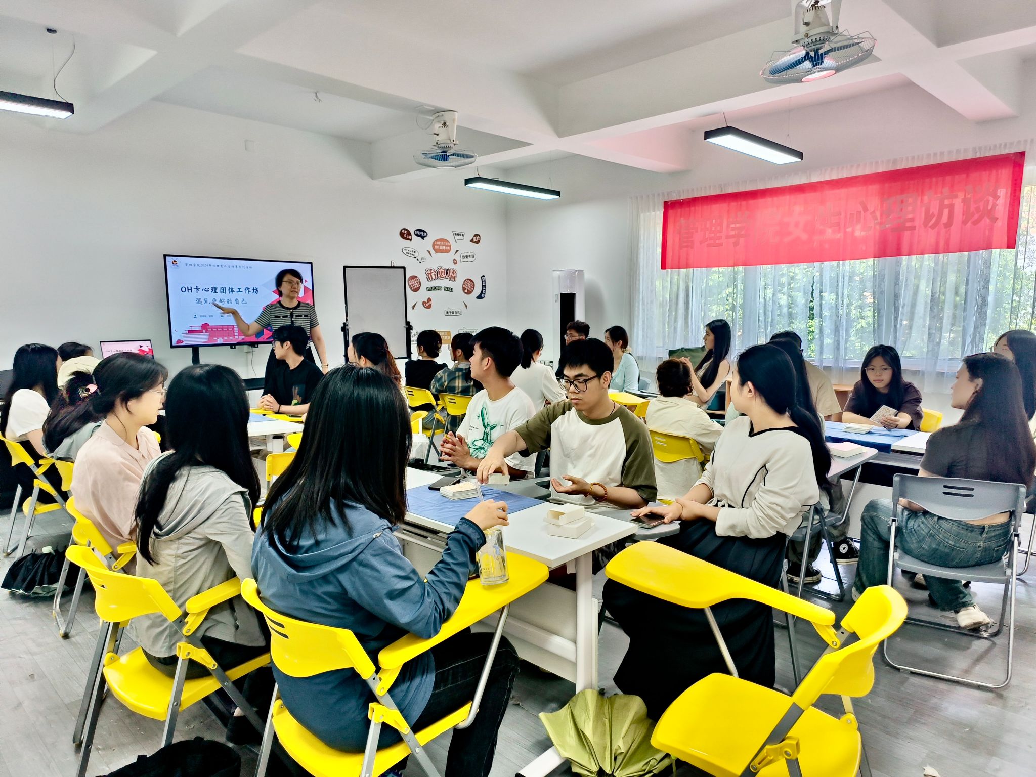 5月23日下午,管理学院在爱+“一站式”学生社区举办了一场别开生面的研究生团体辅导——“OH卡心理团体工作坊:遇见更好的自己”。本次活动旨在引导同学们探索自身潜意识的奥秘,通过独特的方式认识并接纳真实的自我,活动由我校心理健康教育与咨询中心主任刘蓉主持,20余名研究生参加。