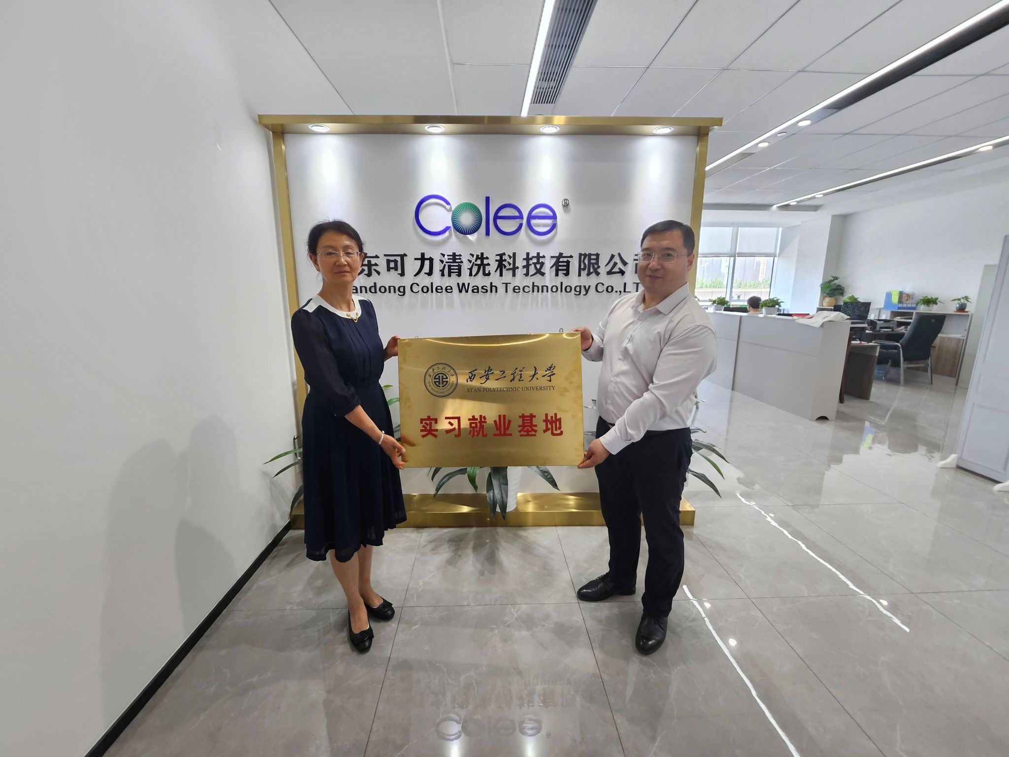 随后,一行人前往山东可力清洗科技有限公司。公司董事长白冰洁、财务负责人刘霞亲自接待,双方就产学研合作、科技创新、实习实训等方面进行了交流探讨,在友好、热烈的氛围中,学院领导与可力清洗科技有限公司举行了实习基地挂牌仪式,为双方深化交流合作实现共赢奠定了基础。