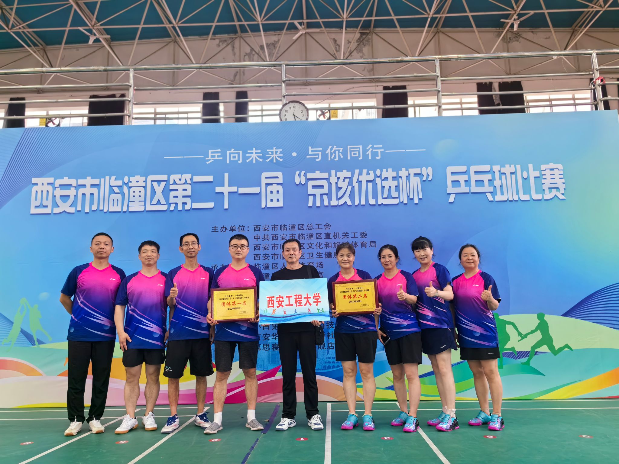 本次比赛由西安市临潼区总工会、中共西安市临潼区直机关工委、西安市临潼区文化和旅游体育局、西安市临潼区卫生健康局主办,临潼区人民体育场、临潼区工人文化宫承办,作为历年来临潼区乒乓球界最隆重的赛事,共吸引了52支乒乓球队和88名个人报名参赛。我校教职工乒乓球代表队在赛前进行了精密的排兵布阵和科学的战术规划,经过队员们精诚团结、齐心协力的奋力拼搏,一路过关斩将,最终满载而归,获得男子团体甲组冠军和女子团体亚军的好成绩,比赛名次创历史新高。闫炜荣获中年组女子单打第三名的好成绩。
