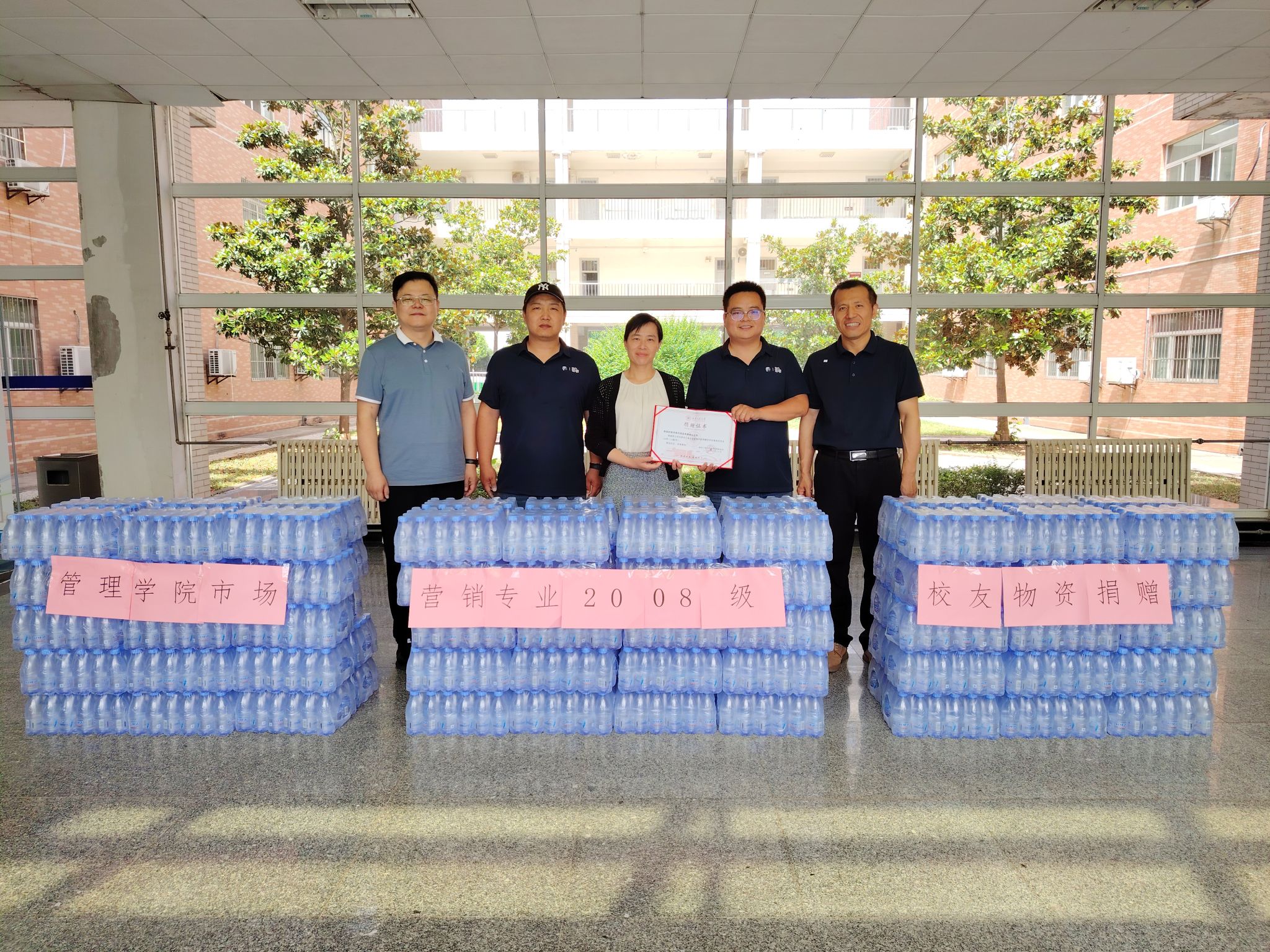 5月30日,管理学院2008级市场营销专业毕业学生贺日朗向学校捐赠了一批饮用水。管理学院院长、校友分会会长李艳,党委副书记、校友分会秘书长代锴,院长助理、校友分会副秘书长陈恒参加捐赠仪式。