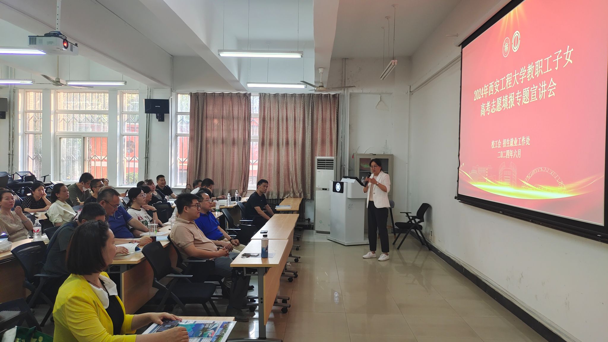 为深入推进“我为师生办实事”,满足广大教职工对高考志愿填报的咨询需求,帮助其全面了解高校2024年招生政策、录取原则、填报方法等信息,校工会与招生就业工作处于6月19日18:30在金花校区7号楼一层就业指导中心宣讲室举行2024年教职工子女高考志愿填报专题宣讲会。学校近50名教职工及其高考子女、校工会、招生就业工作处相关工作人员参加了宣讲会,会议由校工会常务副主席张慧主持。