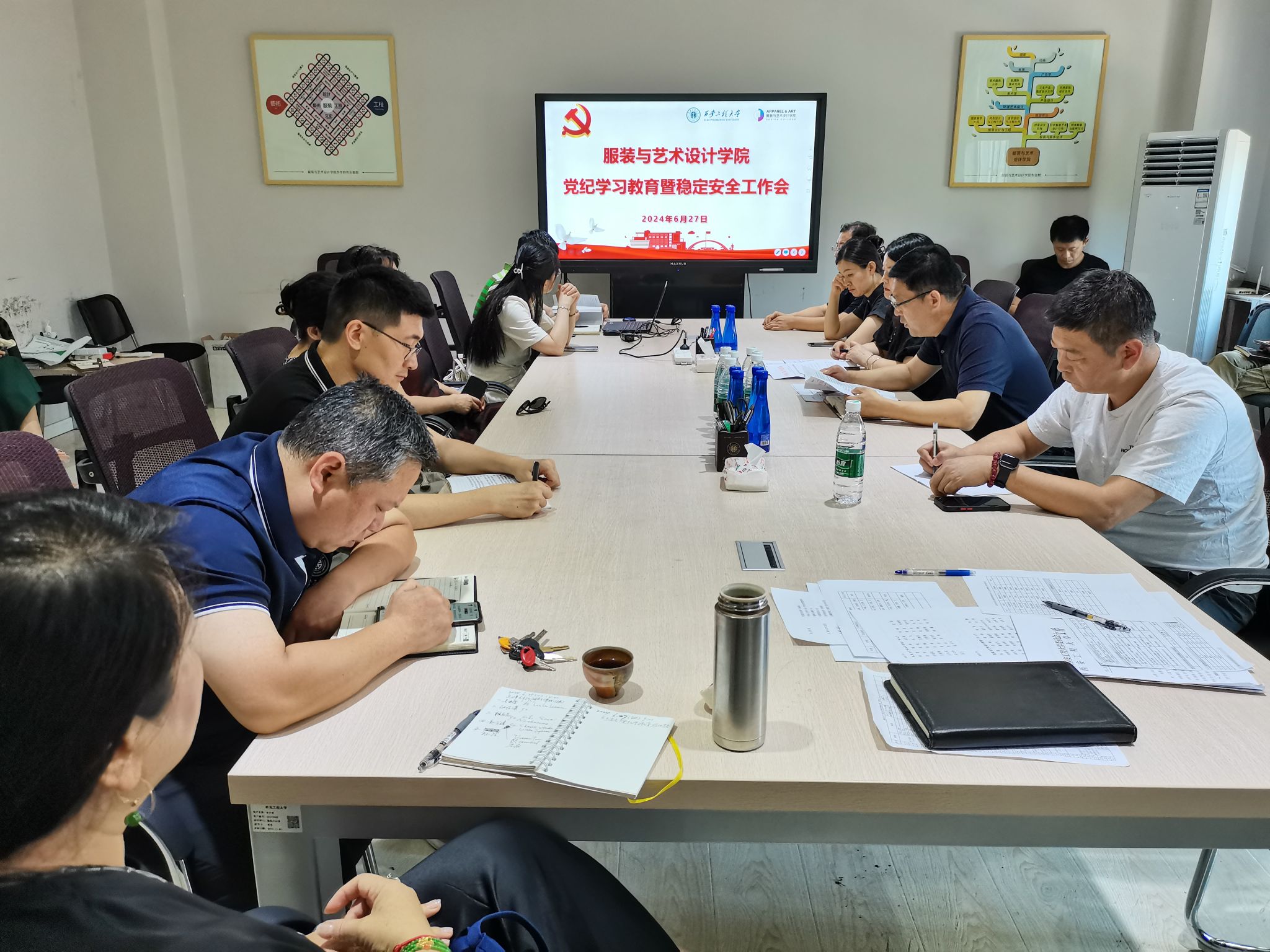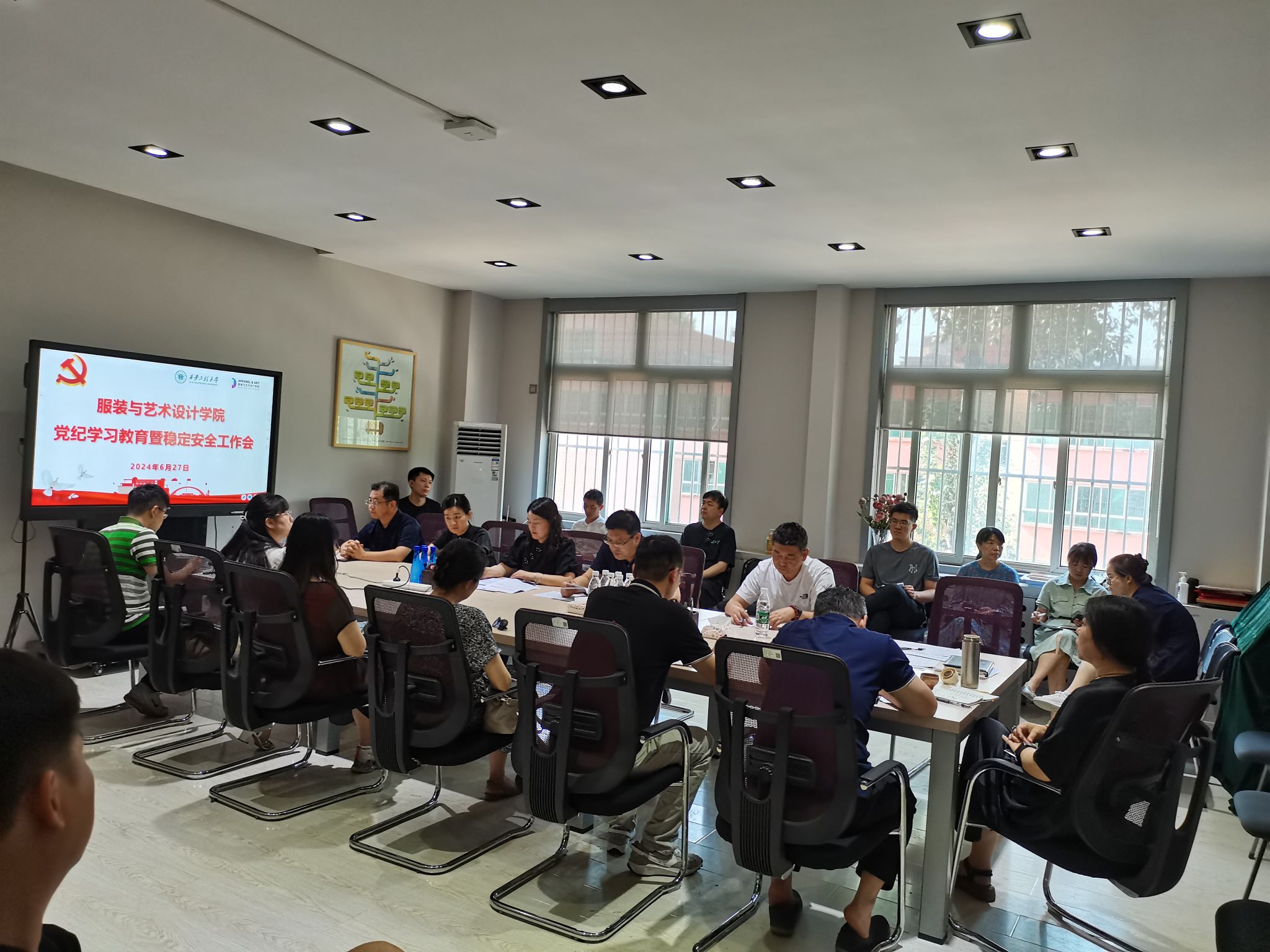 6月27日上午,服装与艺术设计学院在学院三楼会议室召开党纪学习教育暨稳定安全工作会。会议由院党委书记苏博主持。班子成员、院党委委员、系办中心主任、支部书记及辅导员参加了会议。