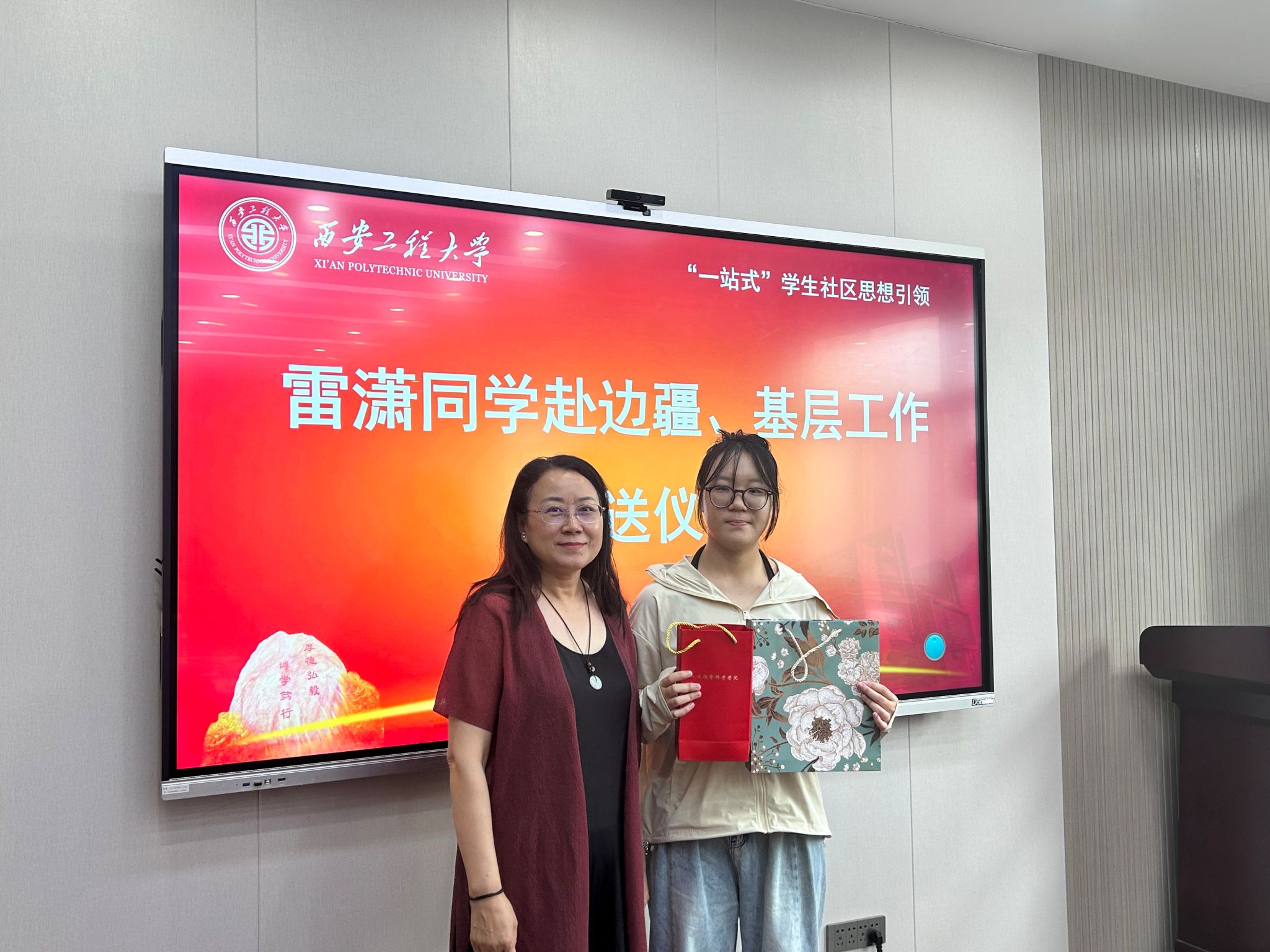 随后,学院为即将赴边疆基层工作的2024届本科毕业生雷潇举行欢送仪式。雷潇同学回顾了在校成长历程,深情表达了对母校和老师培养的感恩之情,表示将不忘传承“厚德弘毅 博学笃行”的校训,在将来的工作岗位上充分发挥自身能力,不负青春、有所作为,为母校争光。与会人员为雷潇同学能够主动将小我融入祖国发展的大我,主动到祖国边疆地区建功立业表示钦佩和赞扬。并希望她坚定理想信念,练就过硬本领,早传佳绩,带动更多毕业生踊跃投身到祖国和人民最需要的地方去。