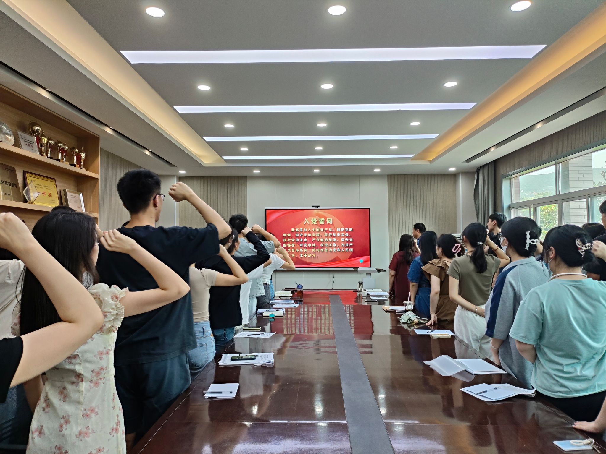 在学院党委副书记赵立涛领誓下,会场内党员全体起立,举起右手,紧握右拳,面向党旗庄严宣誓,一句句誓言,铿锵有力,一句句承诺,掷地有声。党员们在重温入党誓词中不断汲取前进力量,将秉承“厚德弘毅 博学笃行”的校训,在新的党组织继续为党旗增辉,为母校添彩。