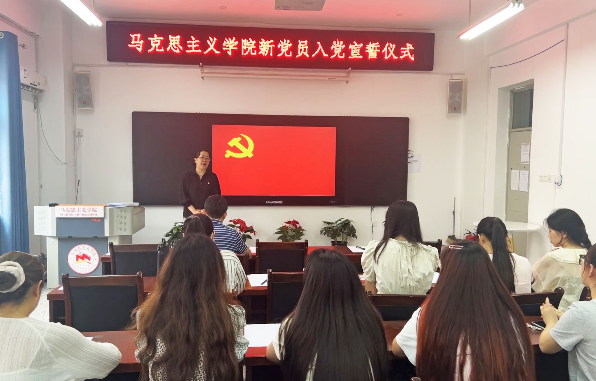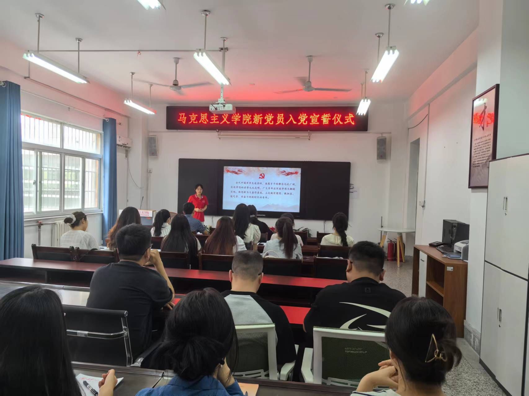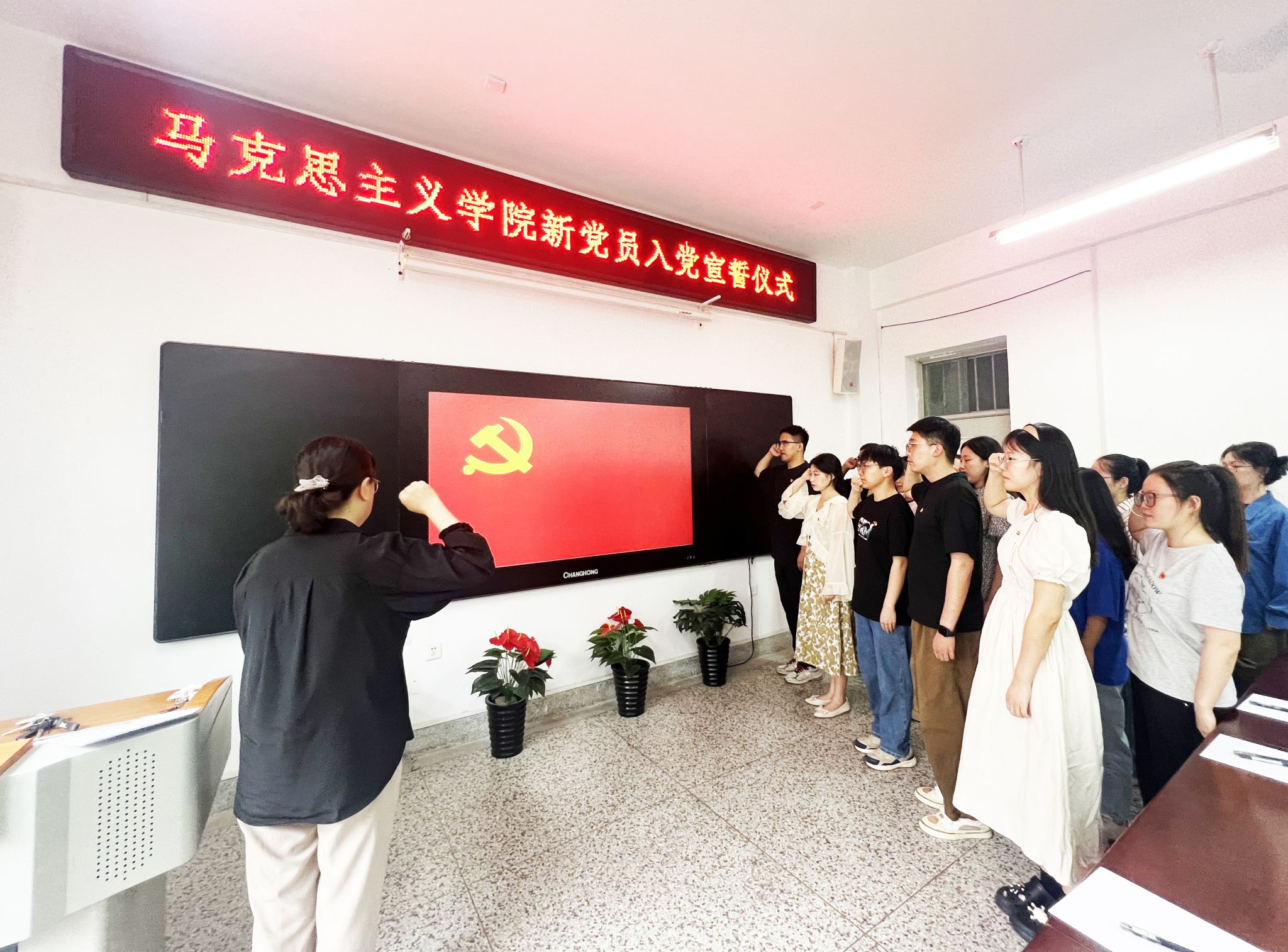 为迎接中国共产党成立103周年,深入学习贯彻习近平新时代中国特色社会主义思想,引导新党员进一步坚定理想信念,牢记党的宗旨,7月1日下午,马克思主义学院党委举行新党员入党宣誓仪式,学院党委书记杨永革、学工办主任孙建荣、各学生党支部委员和19名新发展党员参加了仪式。